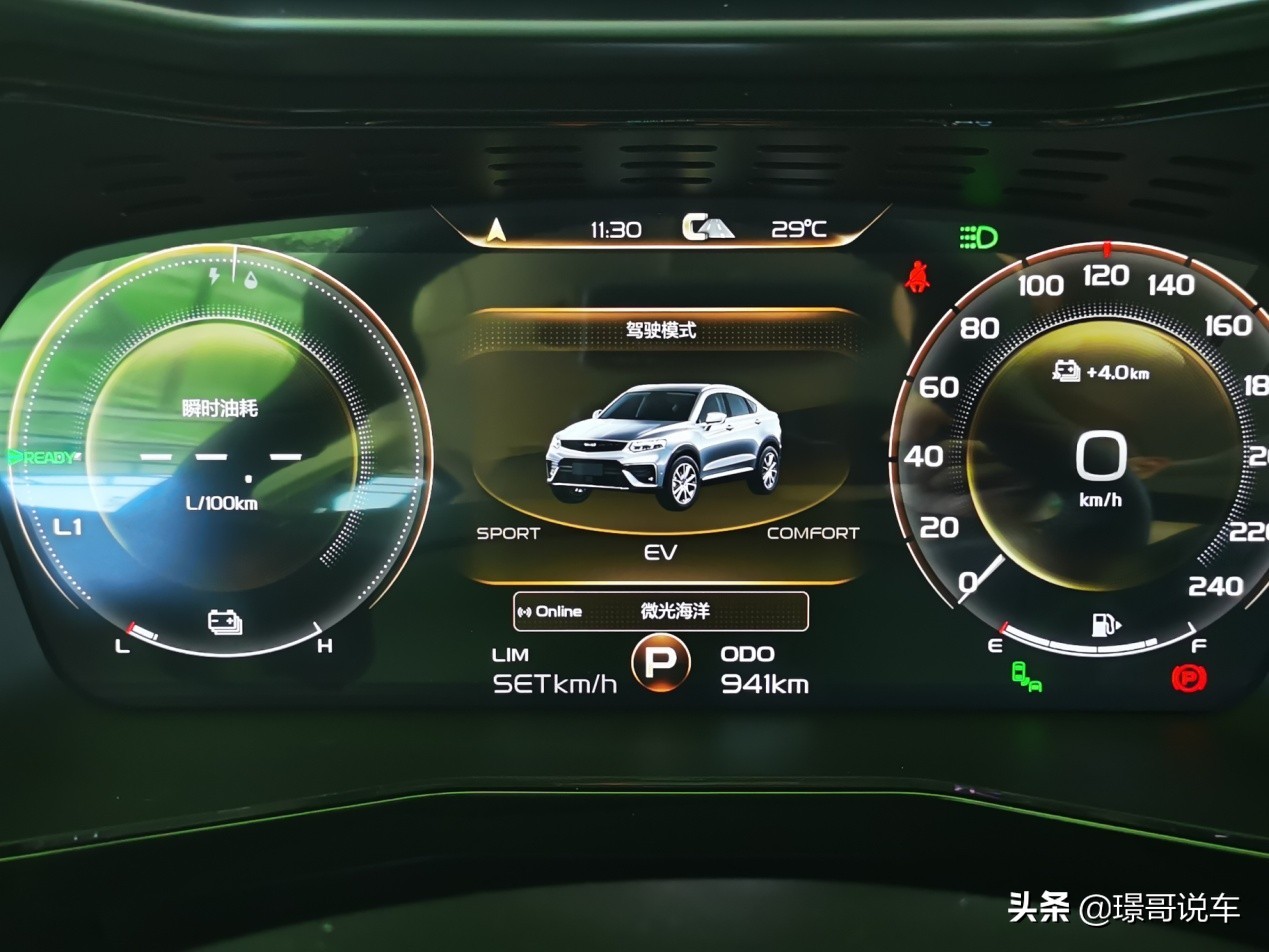 EV模式:这个模式就是以纯电行驶,所以能量回收效率最高,基本上都是L3级的回收,其实基于吉利P2.5的轻混模式,能量回收时的不舒服感非常轻微,至于L2与L1级更是可以忽略不计,要是家里和单位停车场都有充电桩,用EV模式通勤基本上不用燃油,以燃油车每公里0.6元成本,电费每公里也就0.2元,能省多少钱一目了然。
